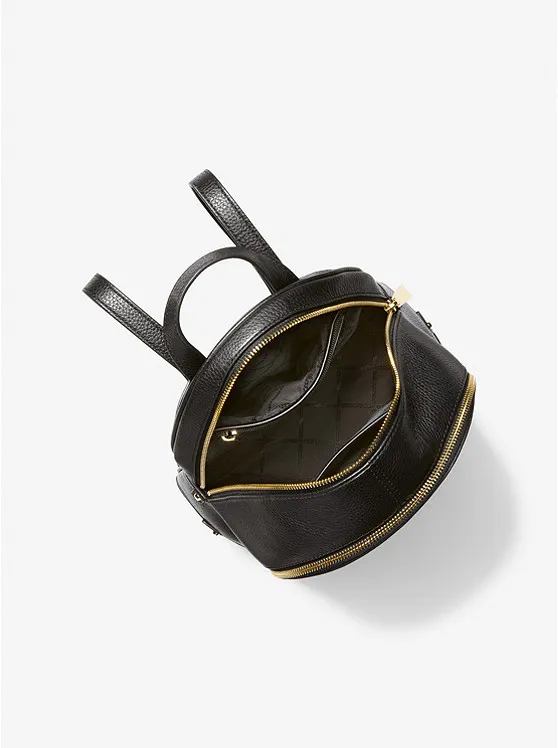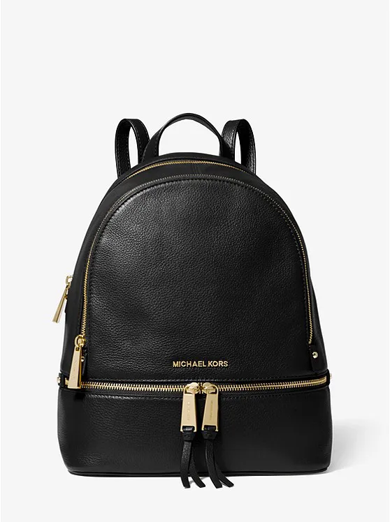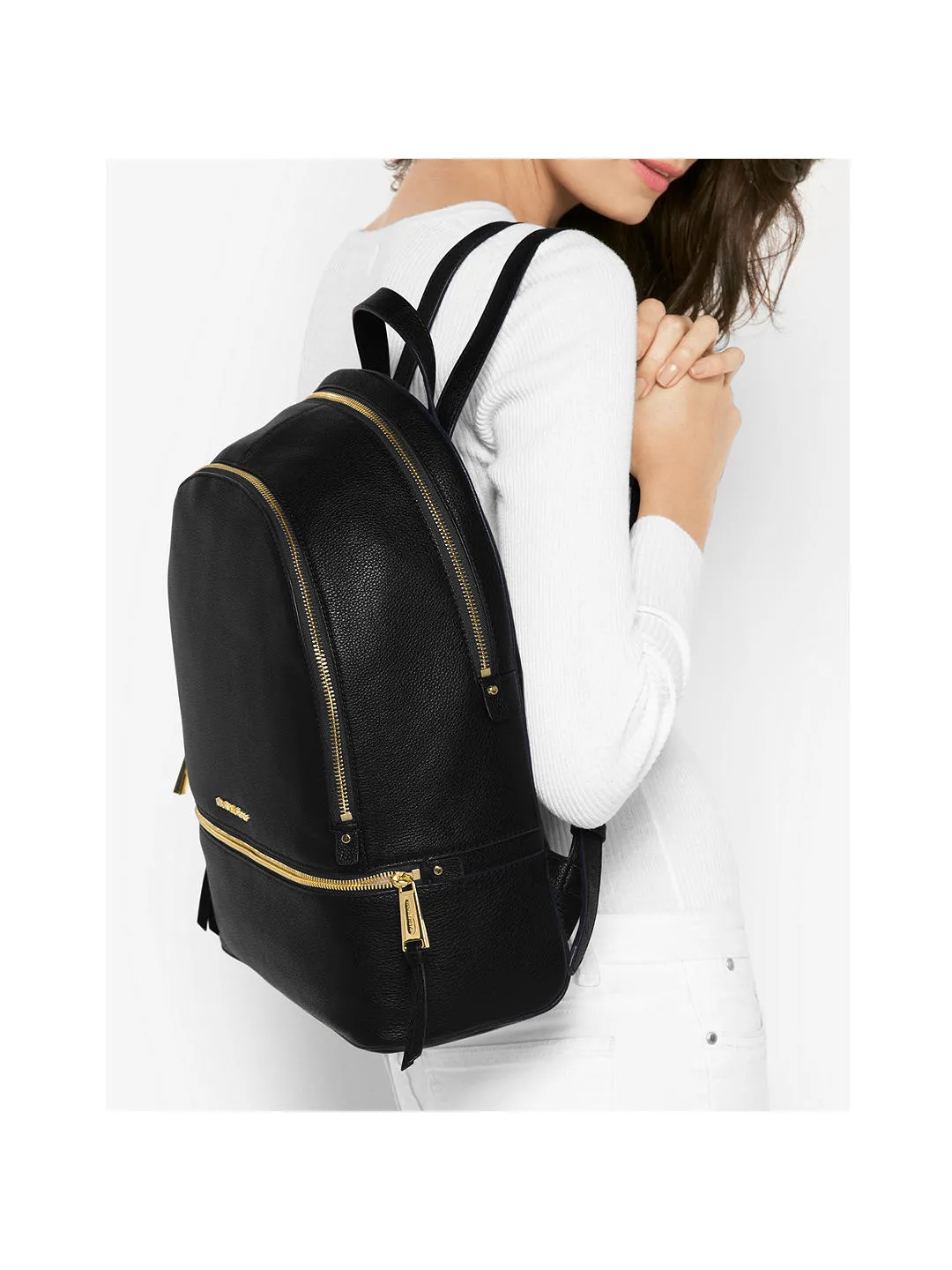 Balo Michael 30S5GEZB1L KorsRhea Zip Large Leather Black Backpack trẻ trung, năng động. Ba lô kích thước lớn phù hợp nơi công sở, du lịch hoặc đựng vật dụng trẻ nhỏ. Ba lô mang theo laptop 13inches, hồ sơ khổ A4 thoải mái rộng rãi.