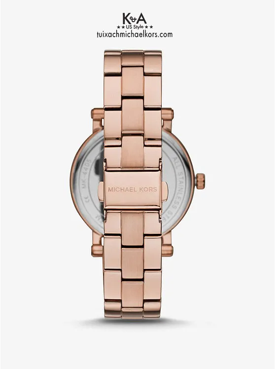 Đồng hồ Michael Kors nữ loại to Norie Pave Rose Gold Tone Watch case 38mm này có mặt số bằng xà cừ trắng với các chữ số La Mã màu vàng hồng và các chỉ số thiết kế thanh mỏng, chuyển động bởi 3 loại kim. Vòng đeo tay bằng thép không rỉ màu vàng hồng.