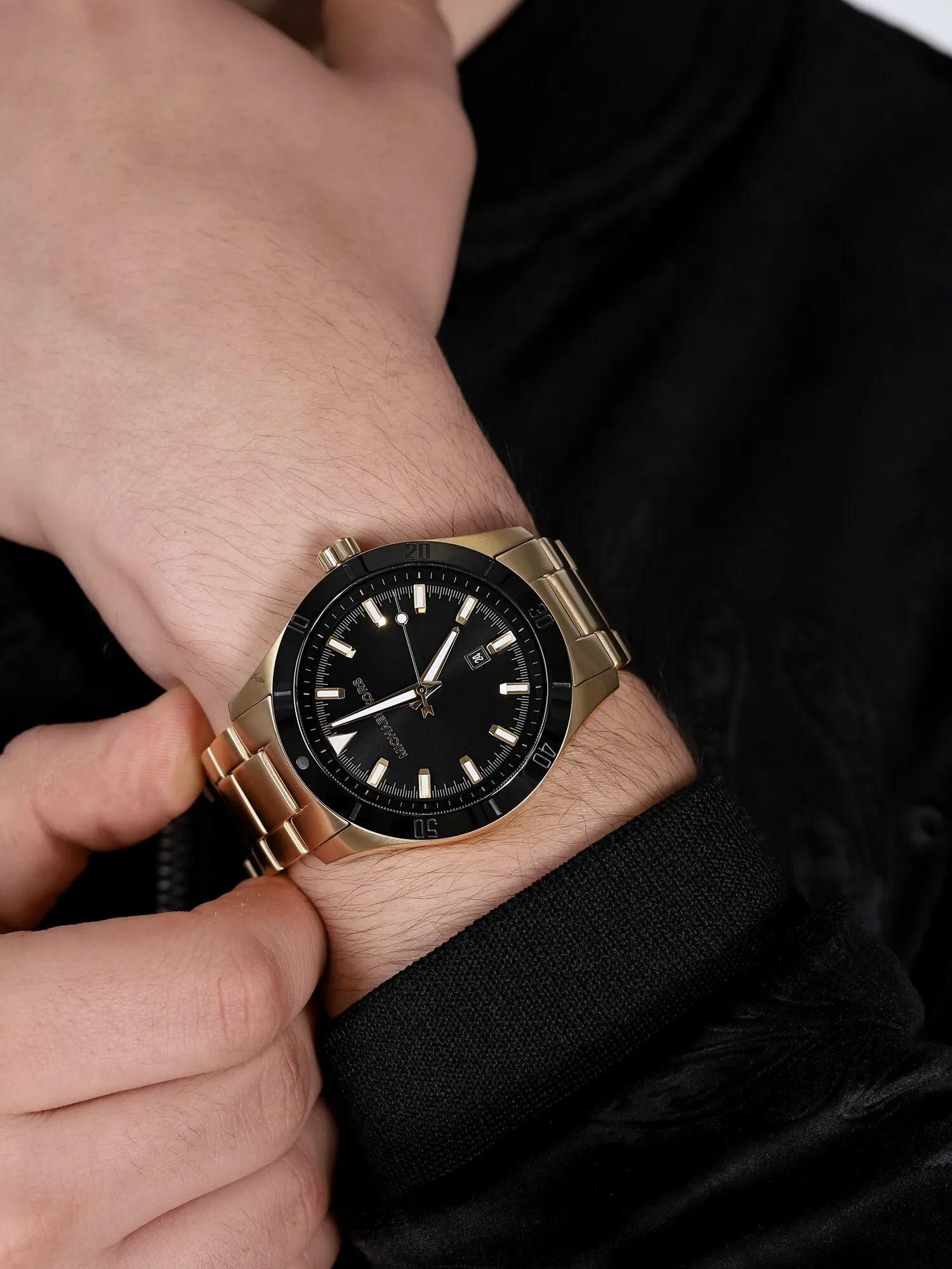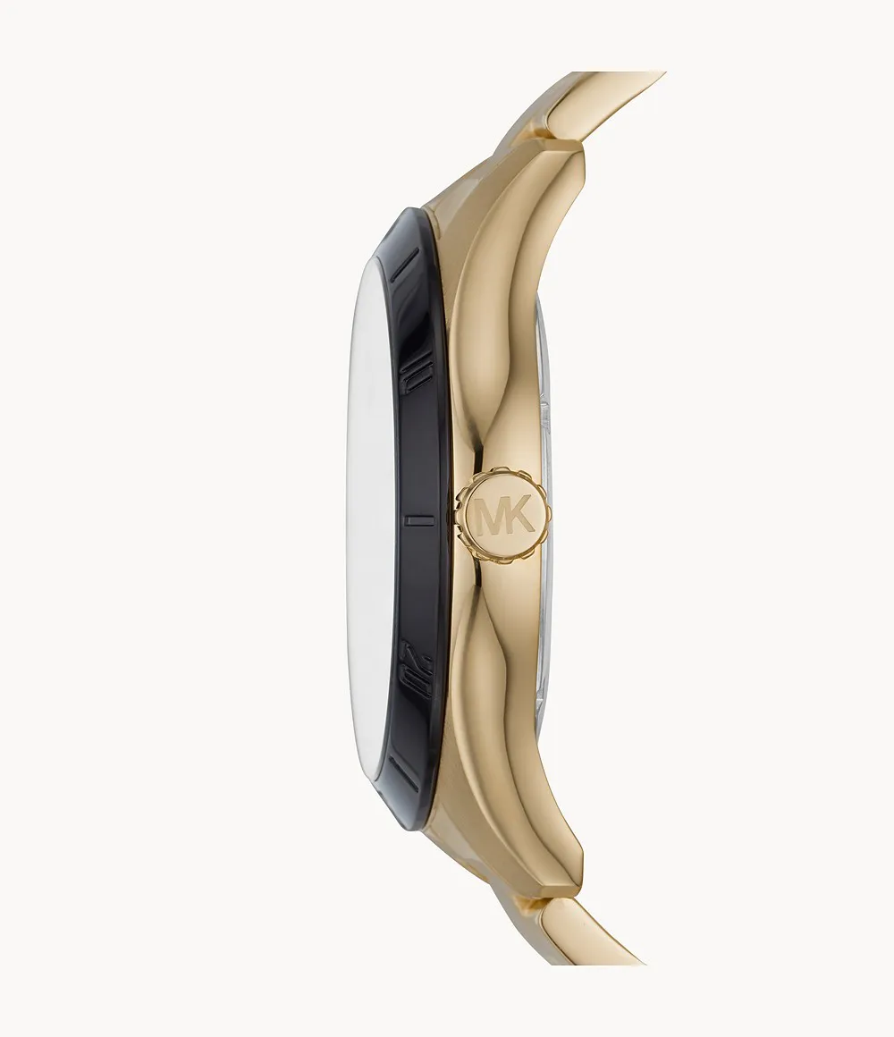 Đồng hồ MIchael nam MK8816 Oversized Layton Gold Tone Watch 44mm Black Gold. Có vỏ bằng thép không gỉ tông màu vàng với dây kim loại đo tachymeter màu đen, mặt số màu đen với các vạch chỉ số, ba kim chuyển động và vòng đeo tay bằng thép không gỉ tông vàng