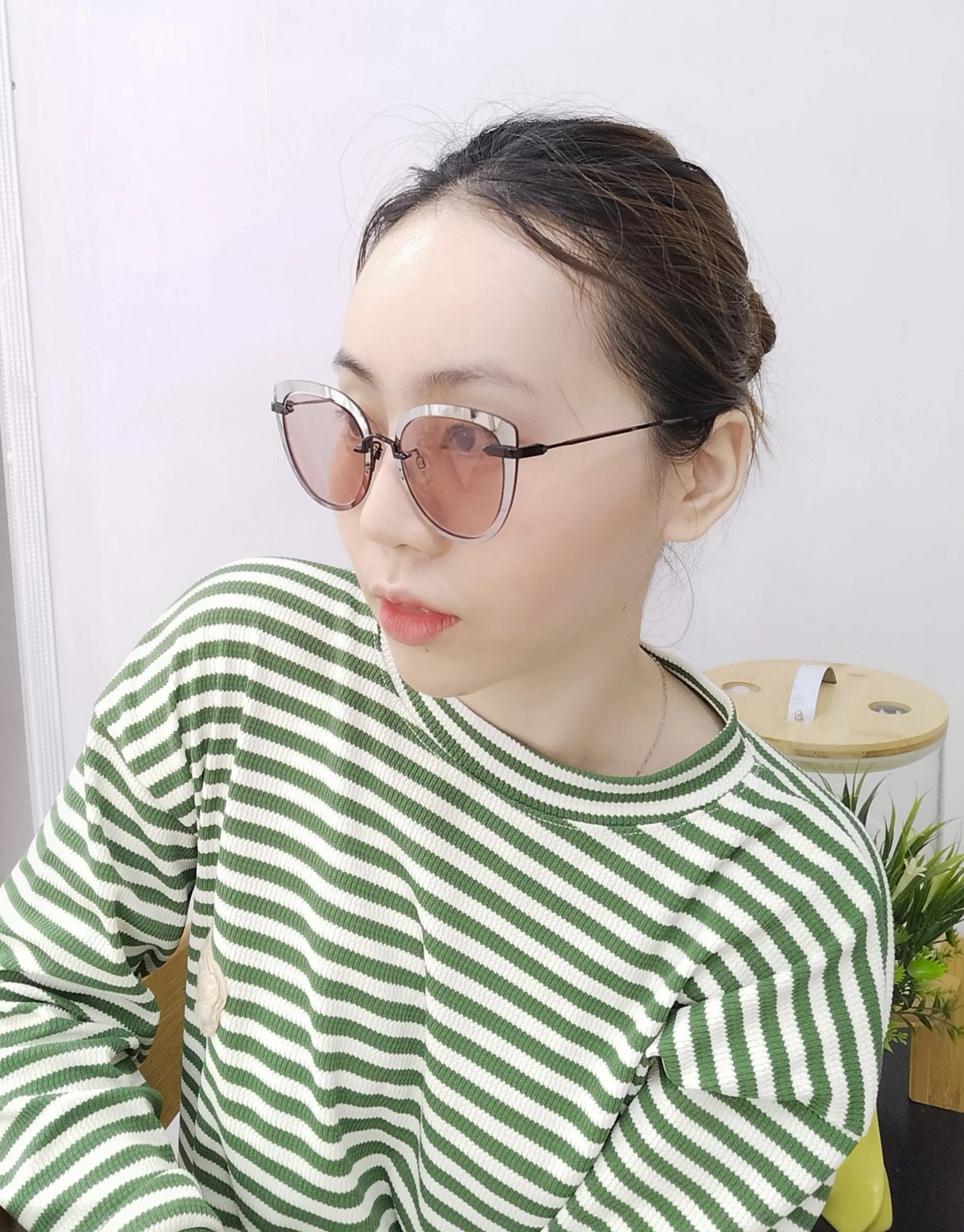 • Tròng kính màu hồng đen. Càng kim loại kết hợp nhựa