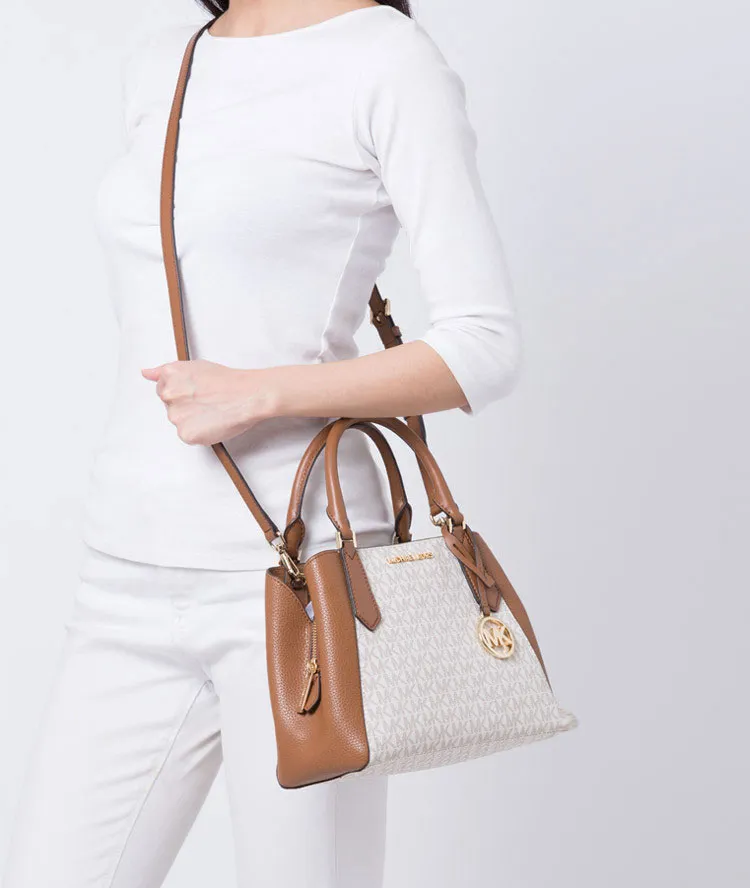 Túi xách Michael Kors công sở đeo chéo Kimberly Small Crossbody Vanilla Bag. Được thiết kế với kích thước vừa vặn, gọn gàng cho bạn khi xách theo hằng ngày ở nơi công sở. Màu Vanilla với họa tiết logo trang trí túi và nâu kết hợp hài hòa, nhã nhặn, giúp bạn luôn thanh lịch và thời trang tại nơi văn phòng.